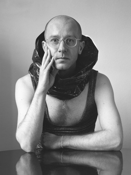 Portrait mit einer analogen Großformatkamera, Inszenierung mit einem Kragen aus einer Mülltüte. Direkter Blickkontakt und Irritation.