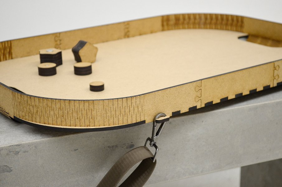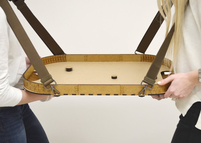 Das Spielfeld hängt zwischen zwei sich gegenüber stehenden Spielern. Befestigt wird das Spielfeld mit zwei längenverstellbaren Gurten, die sich die beiden Teilnehmer umlegen. Die zwei Spieler*innen versuchen, den Puck in das jeweils gegenüberliegende Tor zu befördern. Hierfür werden die Spielfiguren mit Magneten von der Unterseite des Feldes kontrolliert. Die Verlagerung und freie Bewegung des Oberkörpers trägt dazu bei ein zusätzliches Spielfeature zu erzeugen. Es wurde bewusst auf genaue Spielregeln verzichtet, keine Linien oder Markierungen sollen den Spielspaß unnötig beeinflussen oder stören. So entsteht, zwischen den jeweiligen Kontrahenten, stets eine ganz eigene und neue Spieldynamik. Einzig: Gewonnen hat der Spieler*innen der/die den Puck öfter im gegnerischen Tor unterbringt.