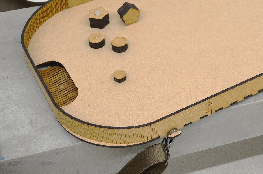 Das komplette »Hölzchenspiel« wurde, trotz seiner Komplexizität, aus nur zwei 5 mm starken MDF-Platten (insgesamt 800×700 mm) mittels Lasercutter geschnitten. Der Aufbau gelingt auch handwerklich weniger geübten Personen, ohne große Schwierigkeiten. Benötigt wird hierfür lediglich ein handelsüblicher Holzleim und ein paar Magnete.