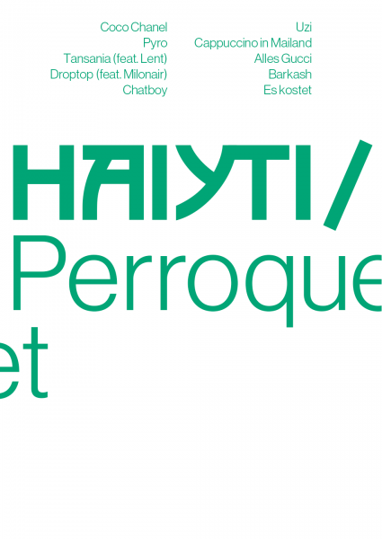 Mein Poster für Haiyti's Album Perroquet ist in einem klarem Raster gestaltet. Die Trennung des Buchstaben E, soll das Raster auflockern.