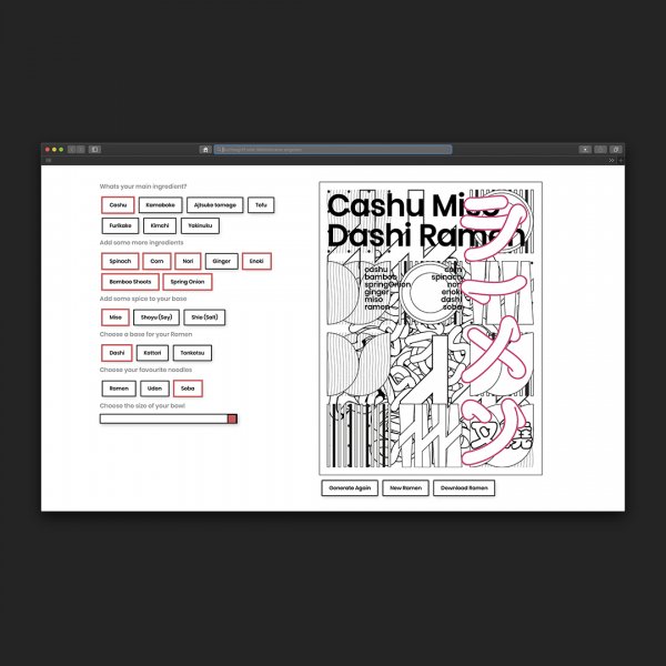Auf der Systematik der japanischen Küche basierend ist der “Ramengenerator” entstanden. Wähle einfach deine Lieblingszutaten und leg sie in deine Schüssel. Danach entscheidest du, ob du eher der Ramen, Udon oder Soba-Typ bist und wie viel Hunger du gerade hast. Der Ramengenerator erstellt dir das passende Plakat zu deiner Lieblingssuppe. So bleibt bei dir mehr als nur die Erinnerung an deine Lieblingsramen hängen.