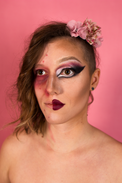 Für meine Arbeit wollte ich den Gegensatz durch die geschminkten Gesichsthälften des Models verdeutlichen. MakeUp und Frisur als Gestaltungsmittel für süß und herb.
