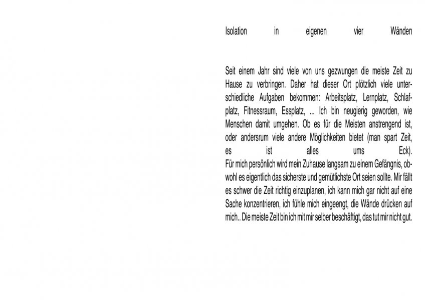Seit einem Jahr sind viele von uns gezwungen die meiste Zeit zu Hause zu verbringen. Daher hat dieser Ort plötzlich viele unterschiedliche Aufgaben bekommen: Arbeitsplatz, Lernplatz, Schlafplatz, Fitnessraum, Essplatz, ... Ich bin neugierig geworden, wie Menschen damit umgehen. Ob es für die Meisten anstrengend ist, oder andersrum viele andere Möglichkeiten bietet (man spart Zeit, es ist alles ums Eck).