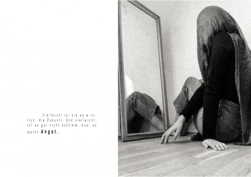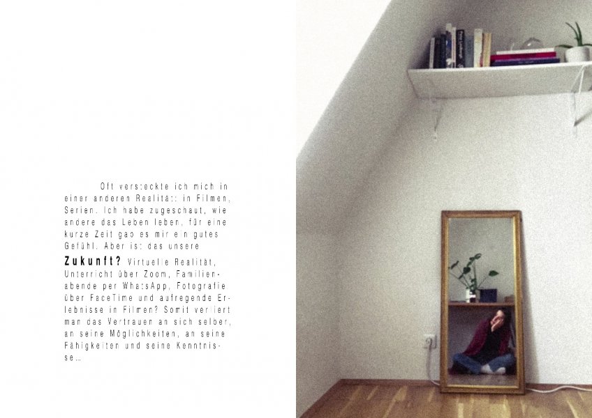 - Oft versteckte ich mich in einer anderen Realität: in Filmen, Serien. Ich habe zugeschaut, wie andere das Leben leben, für eine kurze Zeit gab es mir ein gutes Gefühl. Aber ist das unsere Zukunft? Virtuelle Realität, Unterricht über Zoom, Familienabende per WhatsApp, Fotografie über FaceTime und aufregende Erlebnisse in Filmen? Somit verliert man das Vertrauen an sich selber, an seine Möglichkeiten, an seine Fähigkeiten und seine Kenntnisse… Vielleicht ist sie es wirklich, die Zukunft. Und vielleicht ist es gar nicht schlimm. Aber es macht Angst.