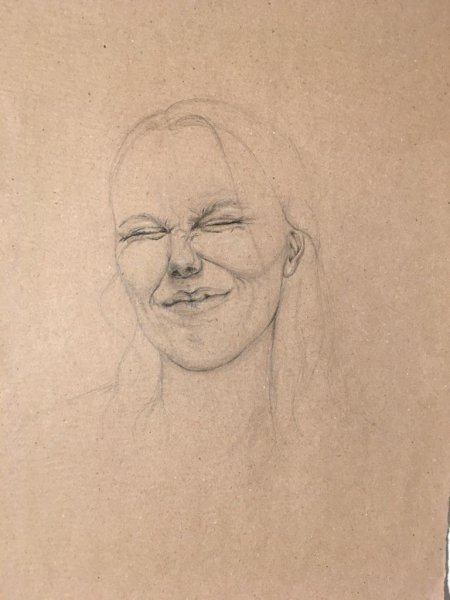 Diese Zeichnung stammt aus dem Modul Portrait Zeichen und ist ein Selbstportrait zum Thema Grimasse. Es handelt sich um eine Bleistiftzeichnung auf grau, braunem Papier, mit weißen Akzenten,