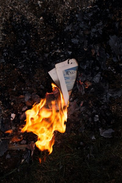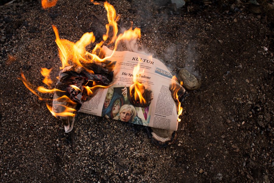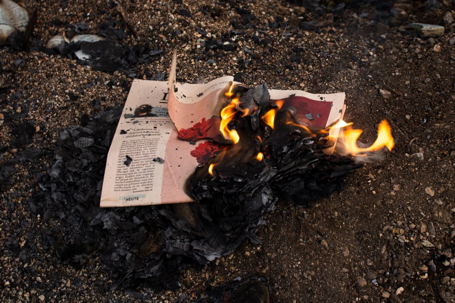 Die Gefährdung der Pressefreiheit wird durch das in Flammen stehen bildlich dargestellt. Die Aufnahmen wurden im Fach Reportage für die Teilnahme an einem Wettbewerb zum Tag der Pressefreiheit 2021 fotografiert.