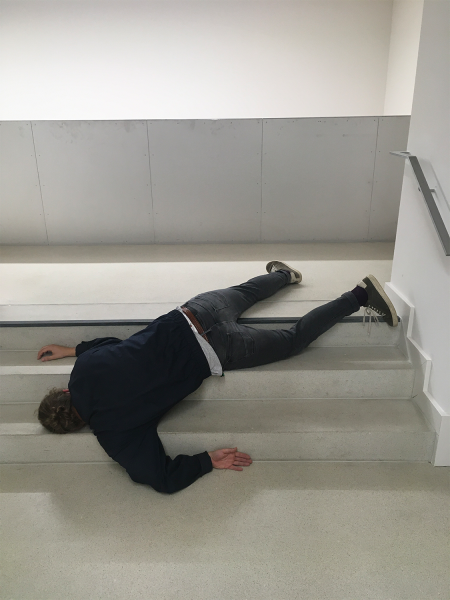 Eine Minute verharrt der Akteur in einer auffalenden Pose, und wird dabei selber zum Kunstwerk. Nach Erwin Wurms Vorbild inszenierten wir in der Gruppe eine Fotografie, bei der wir unseren Kommilitonen Sebastian in einer unkonventionellen Position auf einer dreistufigen Treppe im Zeughaus platzierten. Die hervorstechende, schräge Pose steht im Kontrast zu den lautlos, friedvoll verlaufenden horizontalen Linien in der Komposition.