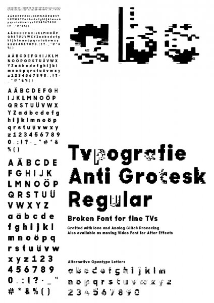 Die Schrift besteht aus zwei schnitten "TVpografie-AntiGrotesk-Regular" & "TVpografie-AntiGrotesk-Unreadable"