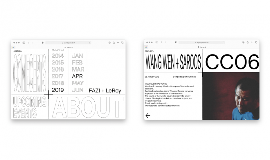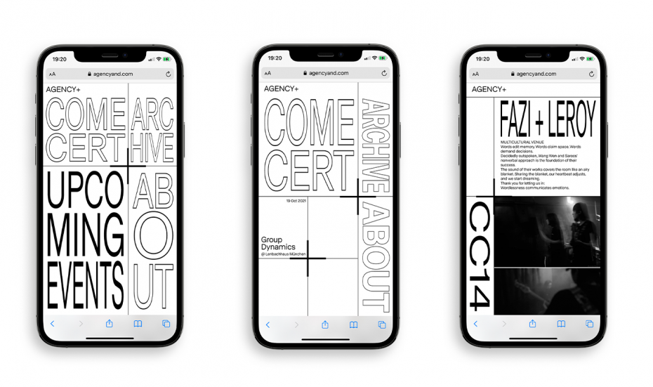 Agency+ hat die Veranstaltungsreihe "Comecerts" ins Leben gerufen, bei der deutsche Musiker auf Künstler aus dem asiatischen Raum treffen und etwas neues auf der Bühne kreieren. Da die Agentur nur as Vermittler und Organisator dient ist das Design sehr schlicht gehalten, damit es mit jedem Künstler funktioniert und der Fokus auf den Künstlern selber liegt und nicht auf der Agentur. Ebenfalls ist das Design sehr flexibel gehalten, damit es sich auch für Veranstaltungen mit zwei, drei oder mehr Künstlern anpassen kann.