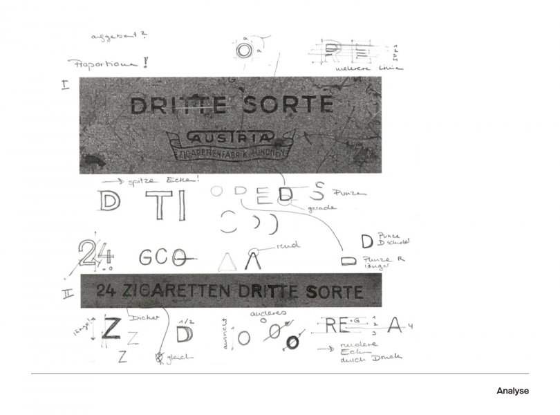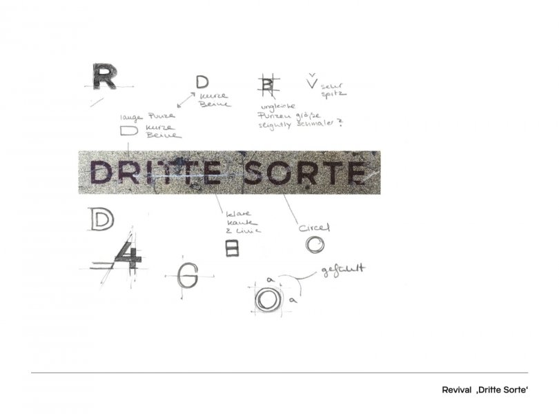 <p>Die Schrift entwickelt sich aus dem Aufdruck einer alten Zigarettenbox aus Metal von einem Flohmarkt. Der Schriftzug "Dritte Sorte" auf dem Deckel diente als Inspiration und als Ausgangsform für die Buchstaben der neu entwickelten Schrift. Die Basis hierbei war die markante Proportion des gedruckten R´s die durch zeichnerische Analysen herausgearbeitet wurde. Es entstanden raumgreifende Versalien, die durch ihre Weite und dem proportionalen Verhältnis zu den dezenten Gemeinen eine geradlinige Headline Schrift bildet. </p>