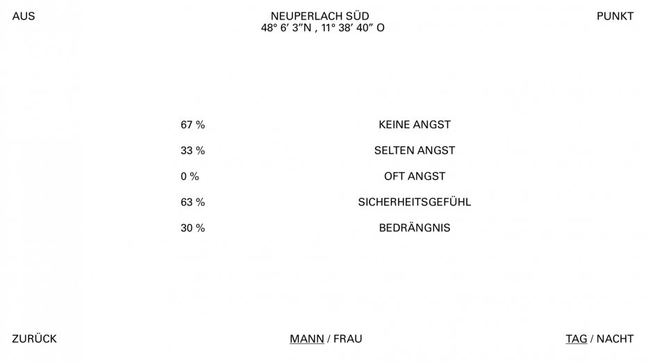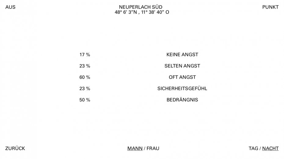 Die Visualisierung verschiedener Angsträume in Städten anhand einer abgewandelten Form einer Art Wetterapp. Mit Hilfe einer Infografik wird ein Angstbarometer der jeweiligen Orten gebildet. Dieses wird anhand von Umfragen an verschiedenen Orten zur Erfassung eines Stimmungbildes zum jeweiligen Angstempfinden bei männlichen oder weiblichen Befragten erstellt. Zur Visualisierung wird die abstrakte Darstellung eines Menschenkopfes genutzt. Durch die algorithmische Verschmelzung verschiedener Köpfe ensteht eine repre- sentatives Bild für das durchschnittliche Empfinden, welches anhand von Anima- tionen dargestellt wird.