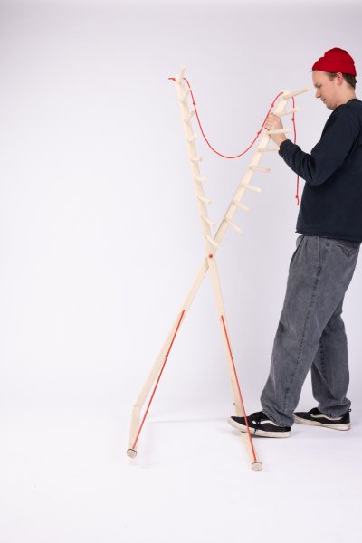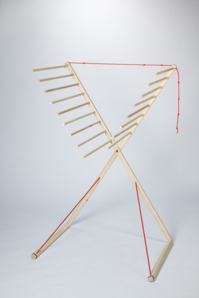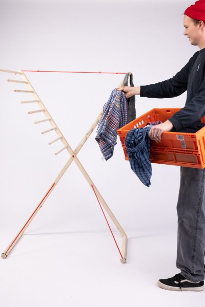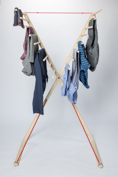 Ein Wäscheständer, der sich einarmig aufstellen und bestücken läßt und sich sonst unauffällig hinter dem Schrank dünn macht.