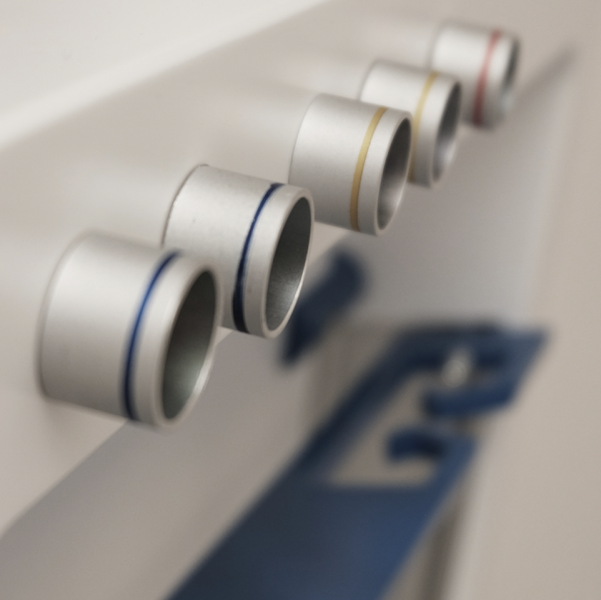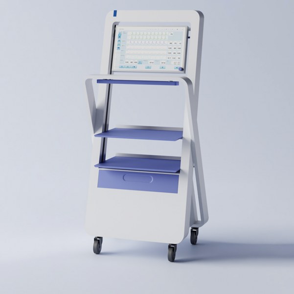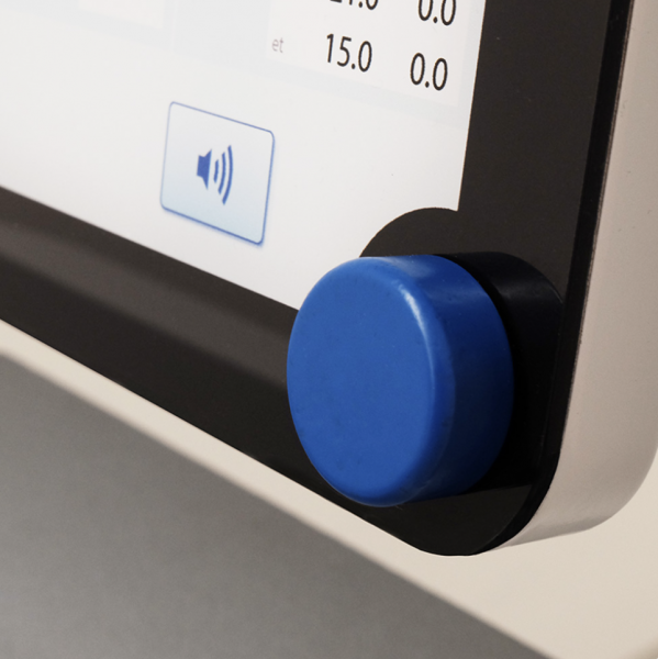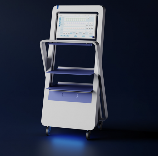 The Tesla MX Loop is a medical equipment carrier that makes up the anesthesiologist's workspace in the MRI. It consists of 2 intertwined belts equipped with standard rails inside. An magnetic field indicator display at viewing height and one below the unit that can illuminate the floor. A 21-inch screen with rotating push button in 16:9 format for an even larger display of vital signs. This can also be swiveled. In the upper area of the back are the connectors at a comfortable height and suspended in the standard rail and thus height-adjustable cable management system in which the cables can be hung in different ways.