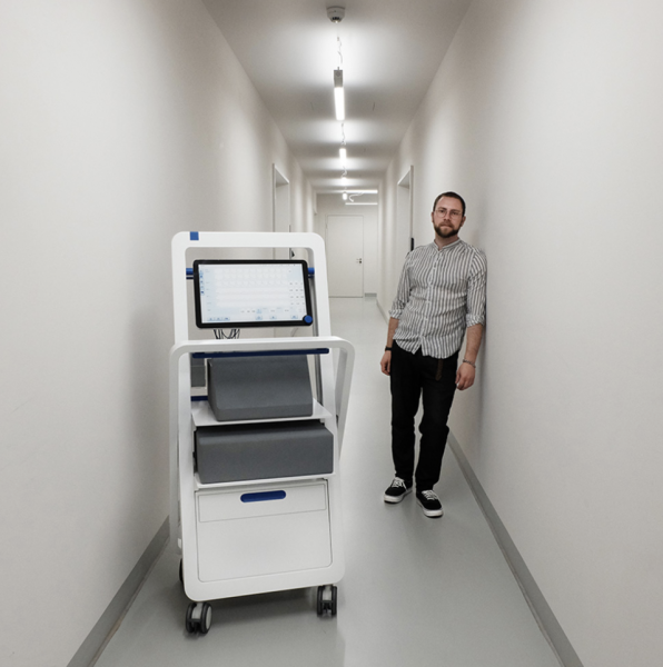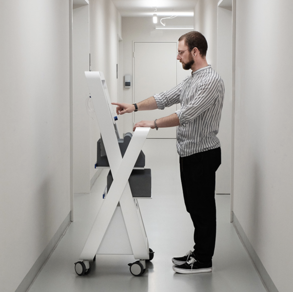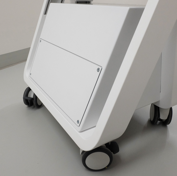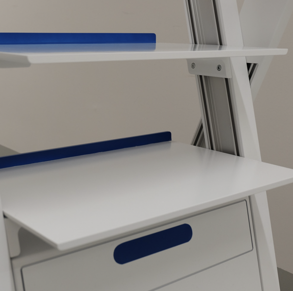 The parking brake is not in the area of the foot but in the hand area to be able to reach it more comfortably. The two shelves can accommodate equipment up to 50 cm wide. These are visible from almost any angle due to the positioning of the shelves. With 10 cm height, we have a spacious drawer for consumables in the front area. This can then be opened by pressure. I have deliberately dispensed with a handle here. To avoid undercuts in places that are constantly touched to ensure hygiene here. On the back we have the access for the house and service technician. Through the large flap the module box can be easily removed.