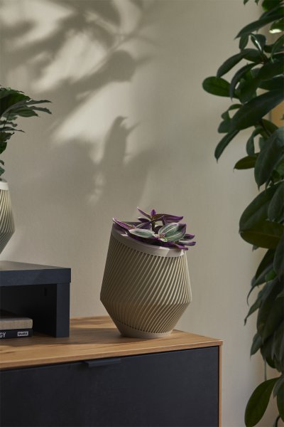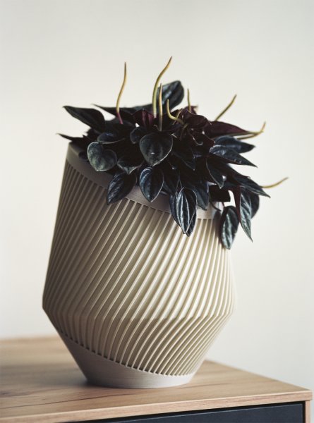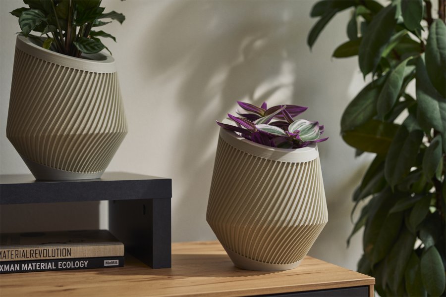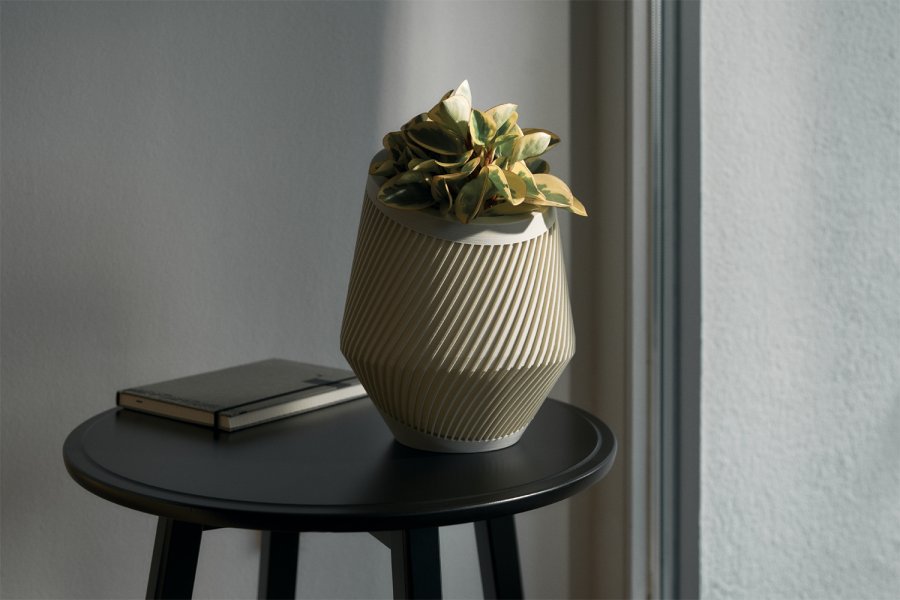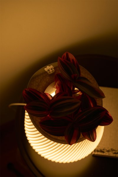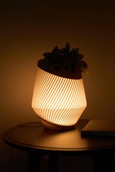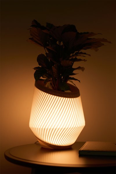 wurde im Rahmen des "Circular"-Projekts als symbolisches Produkt entwickelt, um zu zeigen, dass wir alle Materialien, die wir der Natur entnehmen, nicht als selbstverständlich ansehen und unsere Ressourcen verantwortungsvoll nutzen sollten. Sie hat die Fähigkeit, Kohlendioxid (CO2), Stickoxide (NOx) und flüchtige organische Verbindungen (VOC) zu absorbieren und zu mineralisieren und sie in Partikel umzuwandeln, die sowohl für die Umwelt als auch für den Menschen unschädlich sind. Die Form ist inspiriert von gefalteten Blättern und die Hülle imitiert die Lamellen von Pilzen, um die Oberfläche zu maximieren und das Produkt noch effektiver zu machen. Die Leuchte wird auf einem herkömmlichen FDM-Drucker im 3D-Druckverfahren hergestellt und ist vollständig recycelbar, ohne