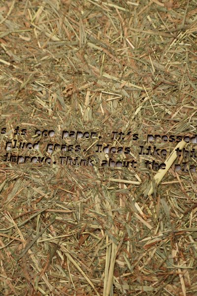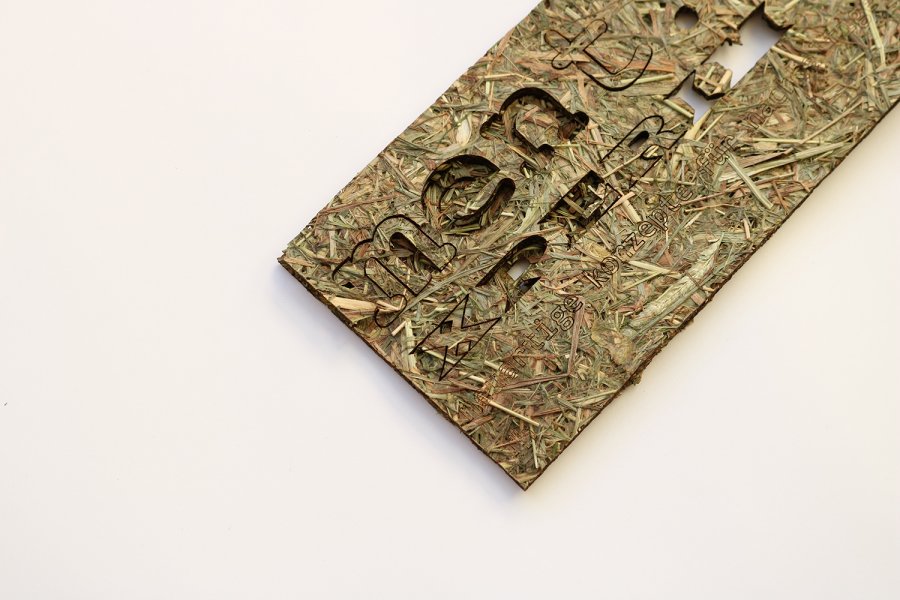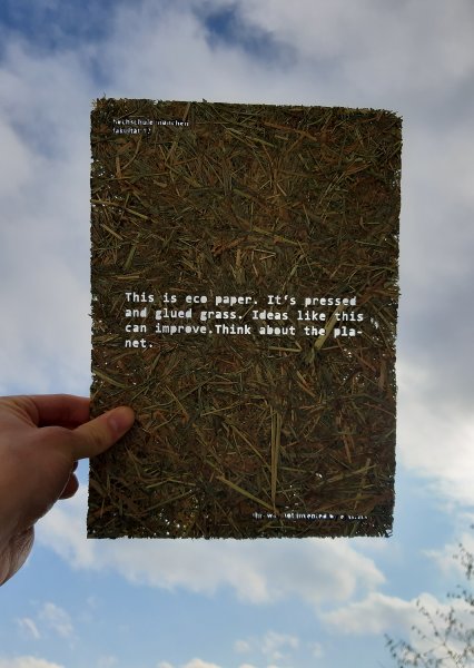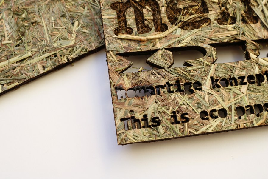 Es handelt sich um Rasenabschnitt, der mit einem Mehl-Wasser-Gemisch (Kleister) verklebt, gepresst, getrocknet und zugeschnitten wurde. Mithilfe eines Lasercutters konnte Typografie eingeschnitten und eingraviert werden. Das ECO PAPER ist bis zu 5 Millimeter dick und ist dementsprechend steif. Durch ein solches Herstellungsverfahren wird der Rohstoff Holz eingespart.