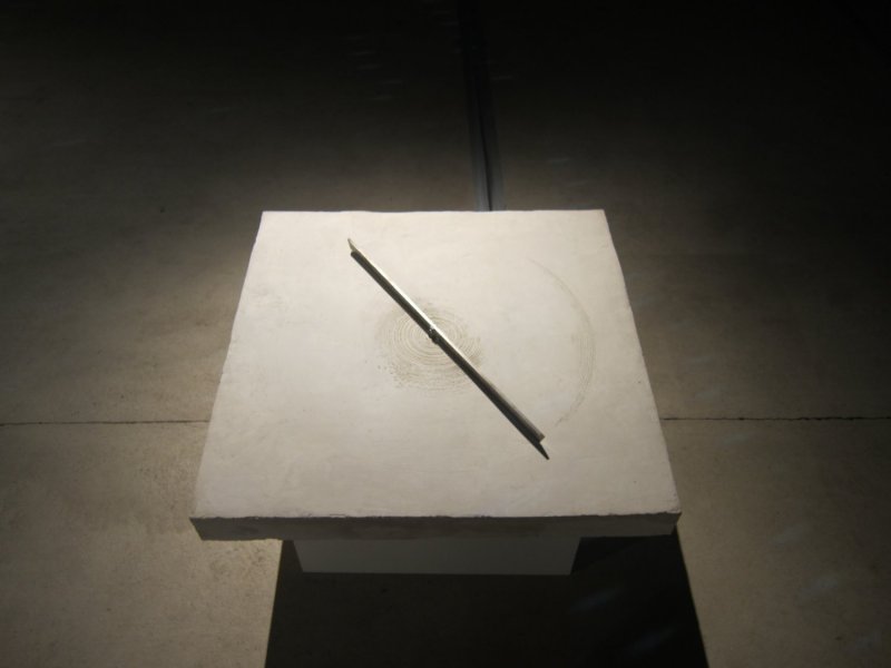 Ein Rechen wird von einem Uhrwerk angetrieben und kratzt langsam mit seinen Zähnen über die Steinplatte, wodurch diese mit jeder Sekunde langsam abgetragen wird und sich die kinetische Skulptur irgendwann selbst auflöst.