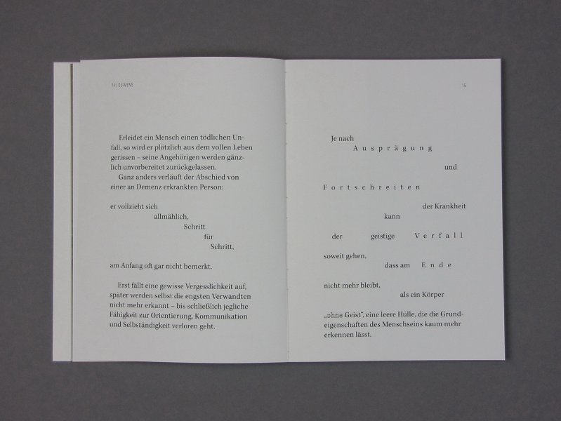 Die Vergesslichkeit und das Chaos im Kopf dementer Patienten werden mit Hilfe von unterschiedlichen Gestaltungsmethoden visualisiert.