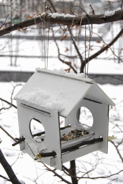 Ein kostengünstiges Vogelhaus, welches für die saisonale Haltbarkeit von einem halben Jahr angelegt ist und anschließend kompostiert werden kann. Daher besteht das Haus aus natürlichen, abbaubaren Werkstoffen. Mit Bienenwachs beschichtete Kraftplex-platten, werden nach dem Steckbauprinzip zusammen gefügt. Die weiß grundierten Einzelteile können durch den Kunden auf Wunsch individuell gestaltet werden. Hierzu empfehlen sich z.B. Wachsmalkreiden. Die Herstellung der einzelnen Platten ist durch die Materialwahl einfach und kostengünstig.